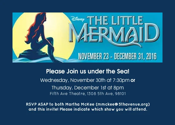 The 5th Avenue Theatre would like to invite you and a guest to Little Mermaid on Wednesday, November 30th at 7:30pm OR Thursday, December 1st at 8pm.