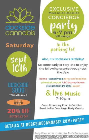 Complimentary food & goodies will be provided to concierge party guests. There will be live music and a variety of activities. For more info: www.docksidecannabis.com/party